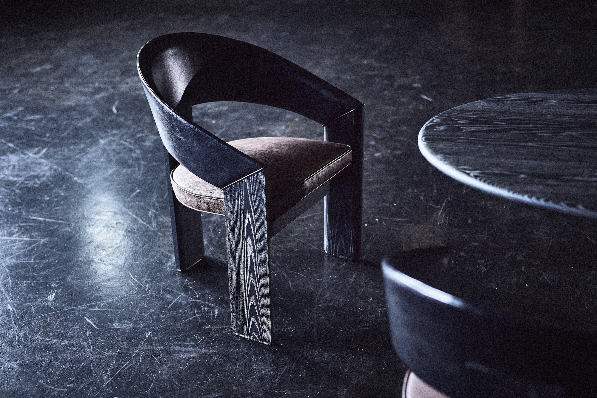 The sofa’s elegant curves are mirrored in the design of our chairs. The backrest and seat are covered in leather for the same luxurious look.