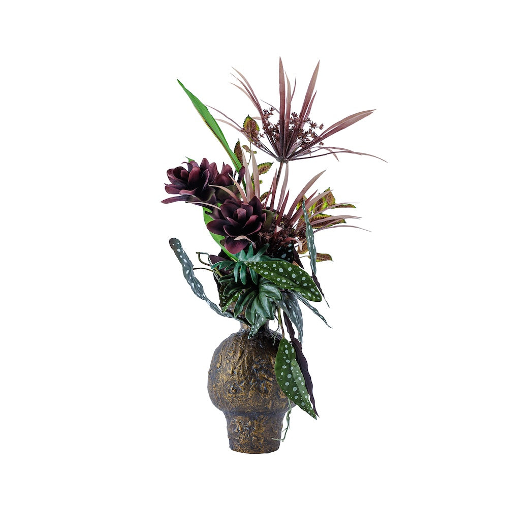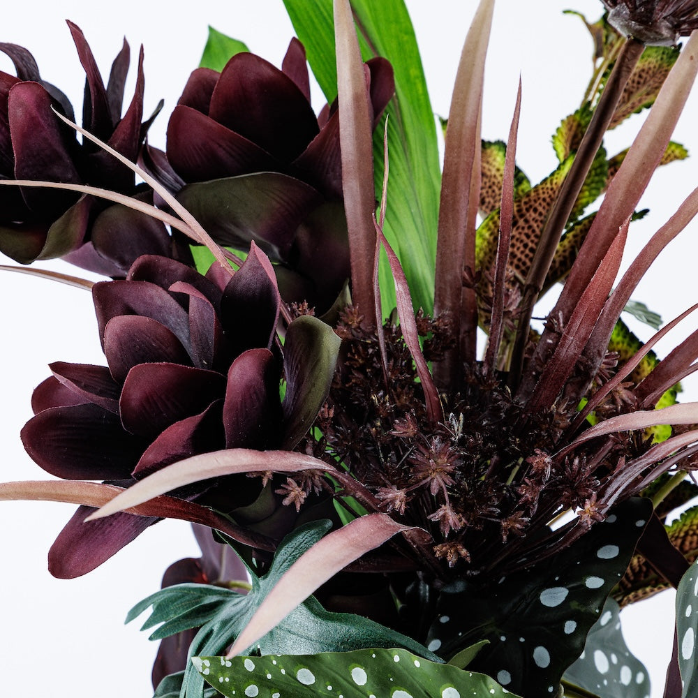 『華影 ーKAEIー』 は、厳選されたフラワーベースに、アーティフィシャルフラワーをアレンジしたコレクション。造花ならではのエキゾチックな配色や独創的なアレンジに、彫刻的な存在感をもつフラワーベースを組み合わせ、ひとつの完成された作品として仕立てました。置くだけで上質な彩りと洗練さを添え、アート空間を創り出します。