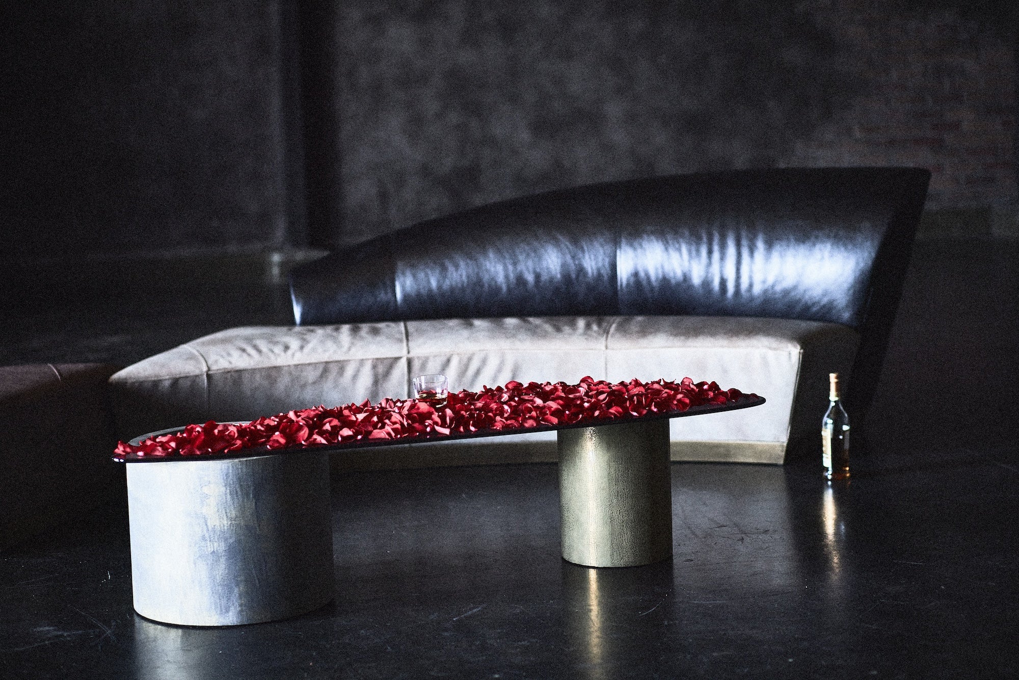 The top is not fixed in place and the position of the bases can be adjusted. Both bases are hollow and can be decorated to create different ambiances, in line with the mood or occasion.