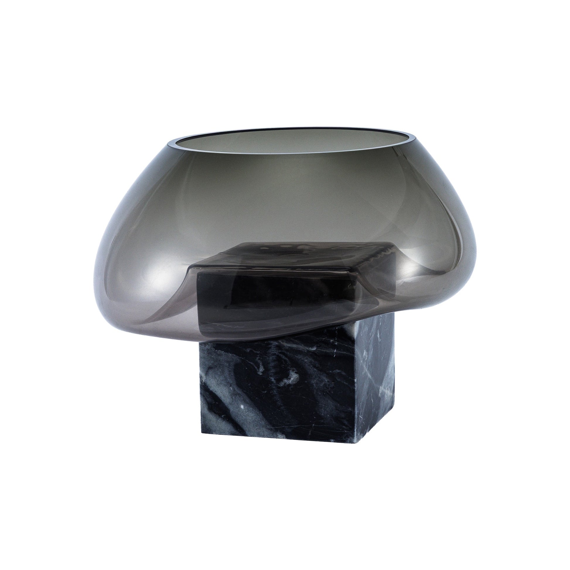 柔らかく広がるフォルムの吹きガラスが、重厚な石のベースに支えられた、彫刻的なフラワーベース。熟練の職人によってマウスブローで作られています。